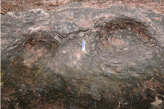 后来,唐永刚先生又在南面100多米冲沟的左上方,一块很大的紫色砂岩上发现了6个恐龙足迹,除了蜥脚类的足迹外,竟然还有兽脚类的足迹。他简直觉得自己中了头奖。虚骨类足迹在岩层上有4个连续分布,每个间隔60厘米,此脚印能明显看到前端的利爪印迹,5串足迹呈西南东北走向,足足有几十个。